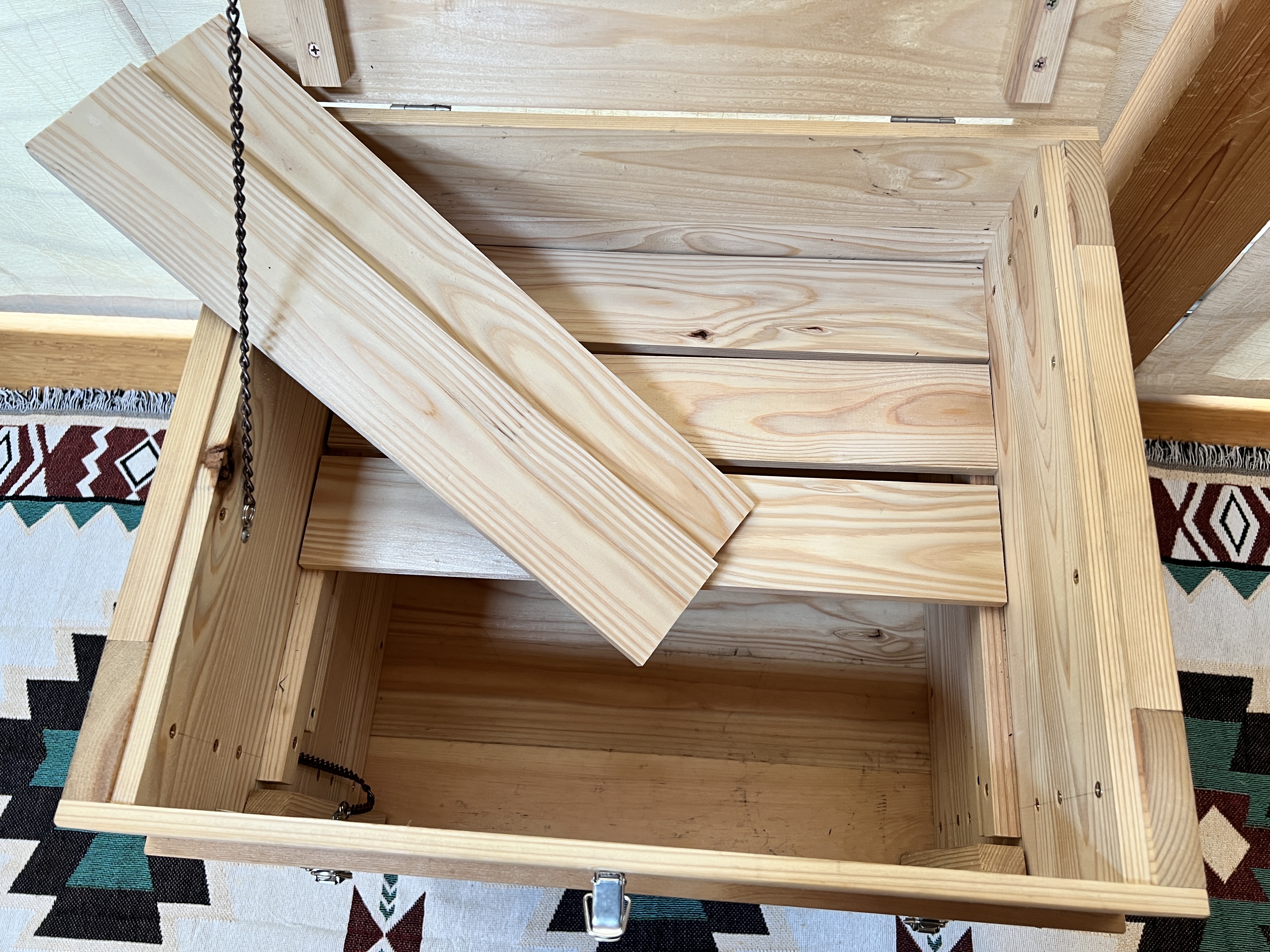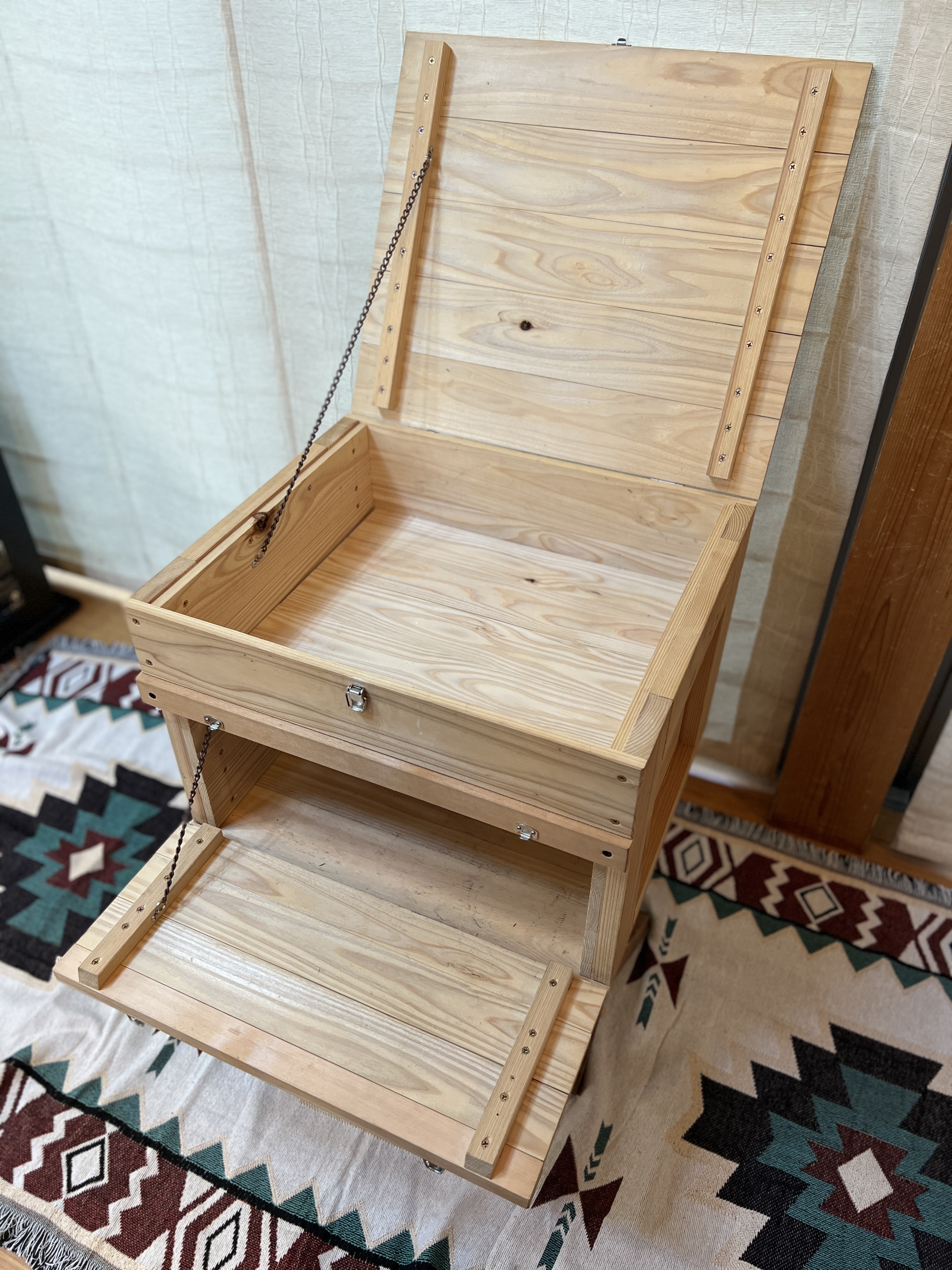 国産杉材で作った収納ボックスです。上下2層の作りになっていて、上部には高さのない小物類、下部には高さのある品物を収納することができます。
